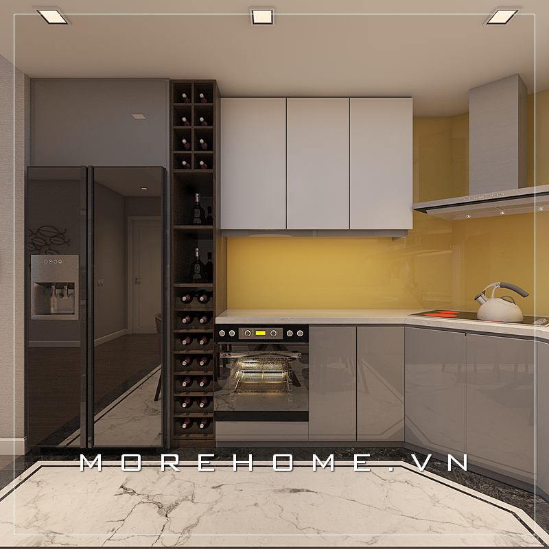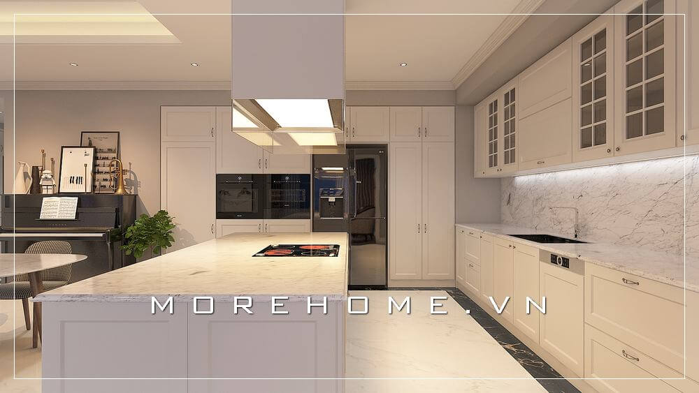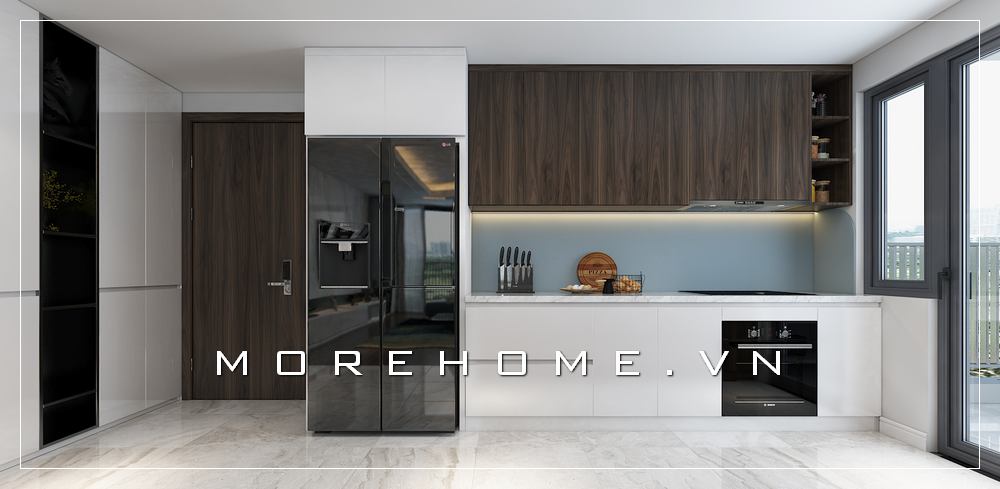 MoreHome giới thiệu mẫu thiết kế nội thất phòng bếp hiện đại trẻ trung có hệ thống tủ gỗ công nghiệp acrylic màu trắng sang trọng dành cho căn hộ, biệt thự và nhà phố