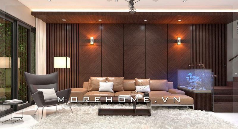 Vẻ đẹp hiện đại, trẻ trung của phòng khách biệt thự, nhà phố với tâm điểm là bộ sofa văng da ấn tượng và nội thất gỗ óc chó cao cấp thu hút mọi ánh nhìn.