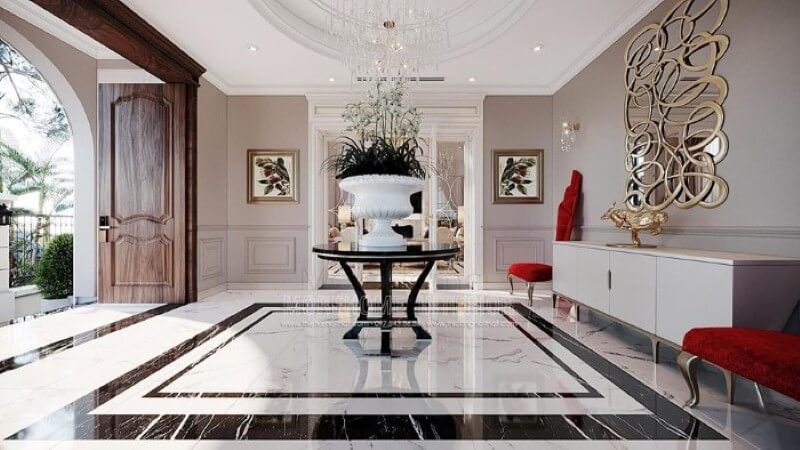 Thiết kế hành lang đẹp ấn tượng với họa tiết độc đáo từ sàn lát đá cùng đường chỉ tường ấn tượng, bức tranh điểm nhấn kết hợp với nét tinh tế từ đèn trần cao cấp.