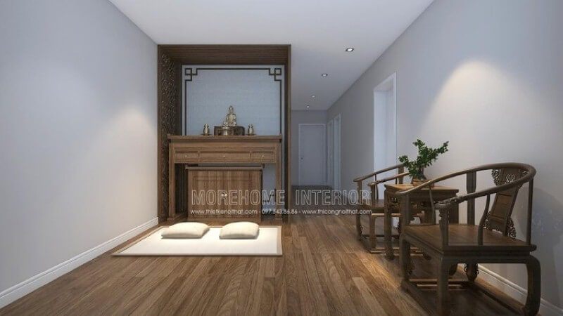 Nội thất phòng thờ chung cư được thiết kế rất trang nghiêm với đồ gỗ nội thất tự nhiên kết hợp gam màu gỗ xưa truyền thống.