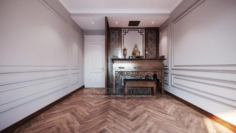 Chất liệu chính căn phòng thờ là gỗ óc chó tự nhiên cao cấp, sàn lát gỗ làm tăng sự sang trọng và sự đầu tư của gia chủ vào không gian nơi đây.