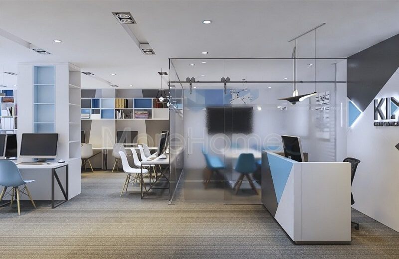 Mẫu thiết kế văn phòng hiện đại, trẻ trung trung với họa tiết trang trí xanh trắng độc đáo